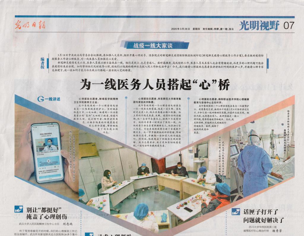 3月26日《光明日报》以“为一线医务人员搭起心桥”为题,对我院教师参加心理援助工作进行了报道。报道了我院王立金老师服务医务人员心理问题的情况。该热线平台的日均热线量突破1000个,每个咨询师以陪伴者和倾听者的角色,陪伴来电者度过最艰难的时刻,重新寻找生活的希望。