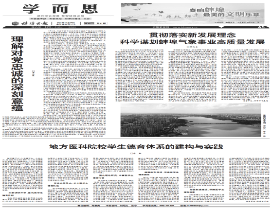 近日,我院辅导员乔凯教授在《蚌埠日报》第五版《学而思》发表了题为《地方医科院校学生德育体系的建构与实践》理论文章。这是本年度乔凯教授继合作撰写的《学好党史,增强思想免疫力》刊登在《中国教育报》后的又一理论文章被报纸发表。相关论文发表后,被国家教育部首页新闻、光明网等网络媒体转载,社会反响良好。