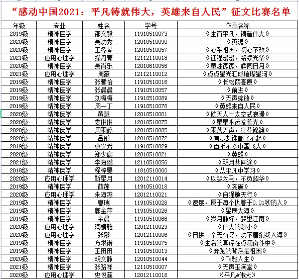 从2002年到今年,《感动中国》已经播出整整20载!为进一步贯彻落实习近平总书记在高校思想政治工作会议上的重要讲话精神,坚持立德树人的根本任务,坚持在日常教育中重视引导学生向先进典型学习,激发斗志,点燃希望,引导大学生珍惜韶华、脚踏实地,把远大抱负落实到实际行动中,让勤奋学习、增长本领成为青春飞扬的动力和能量。2022年3月25 日—4月5日,精神卫生学院党总支组织开展观影《感动中国2021年度人物颁奖典礼》主题征文比赛,本次活动由精神卫生学院师生联合党支部和“润心”青年读书社共同承办,学院全体学生参与。