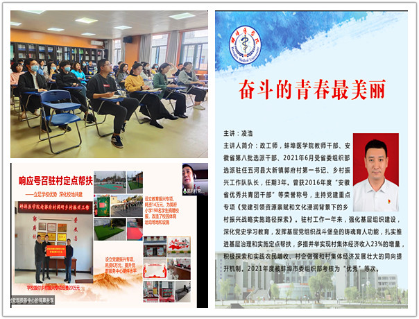 5月12日,特邀我校选派干部、五河县大新镇郭府村第一书记、乡村振兴工作队队长凌浩作“奋斗的青春最美丽”专题报告。凌浩从“响应号召驻村定点帮扶”“脱贫攻坚衔接乡村振兴”“小康社会共赴复兴征程”“五育并举培育时代新人”四个方面对驻村一年的工作进行介绍。他结合基层具体工作,用平实的语言、鲜活的事例,介绍了所在基层单位在强化基层组织建设、深化党史学习教育、发挥基层党组织战斗堡垒的铸魂育人功能、扎实推进基层治理和实施定点帮扶、多措并举实现村集体经济快速增长所做的努力和取得成绩。讲座内容激起大学生强烈共鸣,同学们纷纷表示,凌老师是我们学习的榜样,当下我们要刻苦学习,加强训练,将来必将勇于担当、报效祖国。