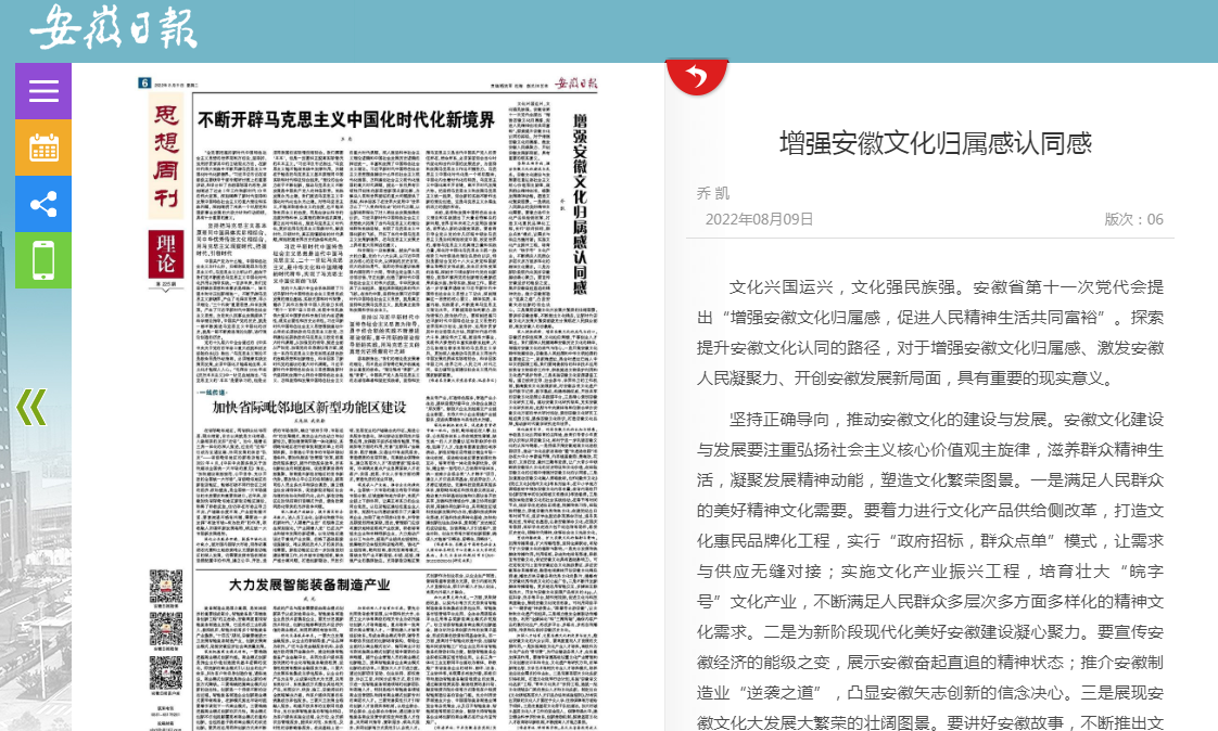 8月9日,我校辅导员乔凯教授在《安徽日报》第06版“思想周刊·理论”发表了题为《增强安徽文化归属感认同感》的理论文章。文章认为,探索提升安徽文化认同的路径,对于增强安徽文化归属感、激发安徽人民凝聚力、开创安徽发展新局面,具有重要的现实意义。坚持正确导向,推动安徽文化的建设与发展;深入挖掘阐释,增强安徽文化的底气与信心;强化教育引导,巩固安徽文化的认知与情感;重视传播效能,扩大安徽文化的辐射与影响;加强人才培育,汇聚安徽文化的优势与动力。这是乔凯教授继6月16日在《中国教育报》“理论周刊”头条刊发学术文章之后的又一成果,研究得到安徽省高校思想政治工作中青年骨干项目资助。文章发表后,被国家级媒体中国经济网等转载,产生了一定影响。