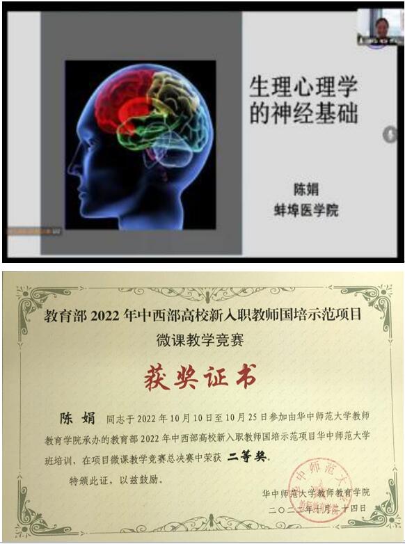 近日,教育部2022年中西部高校新入职教师国培示范项目在华中师范大学举行,来自安徽省、黑龙江省、江西省、四川省、内蒙古自治区、陕西省等中西部六省(自治区)、117所高校共计134名新入职教师齐聚一堂。经15天丰富多彩、形式多样的理论和技术学习与训练,我校精神卫生学院青年教师陈娟历经三个阶段的选拔,以饱满的精神状态呈现了一堂精彩纷呈的教学展示,获得微课竞赛总决赛二等奖。