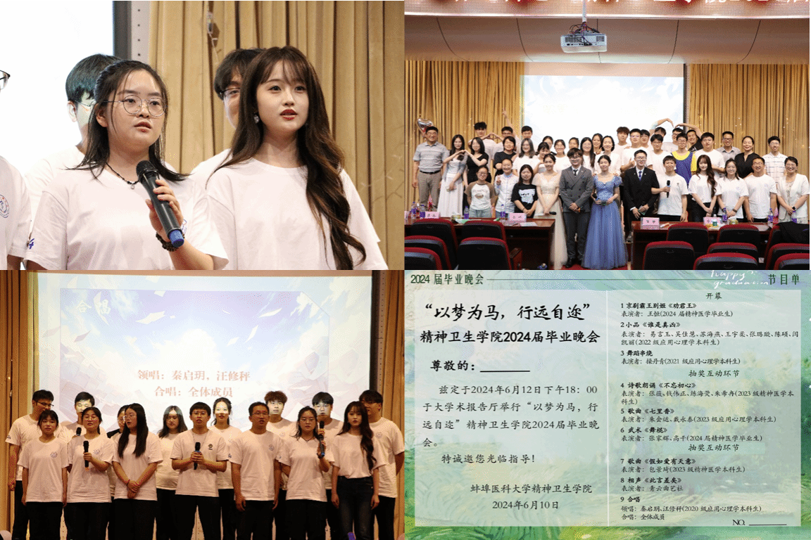 六月,是毕业的季节,是离别的时刻,同时也是劳动耕耘的收获期,是青春梦想的启航点。6月12日下午,精神卫生学院2024届毕业晚会“以梦为马,行远自迩”在学术报告厅隆重举行。院党委书记马嬿、院长张静、党委副书记李礼和专业负责人、教研室负责人、实验中心负责人等参加晚会。2024届毕业生齐聚一堂,欢唱团聚,为毕业文明离校留下难忘的记忆。