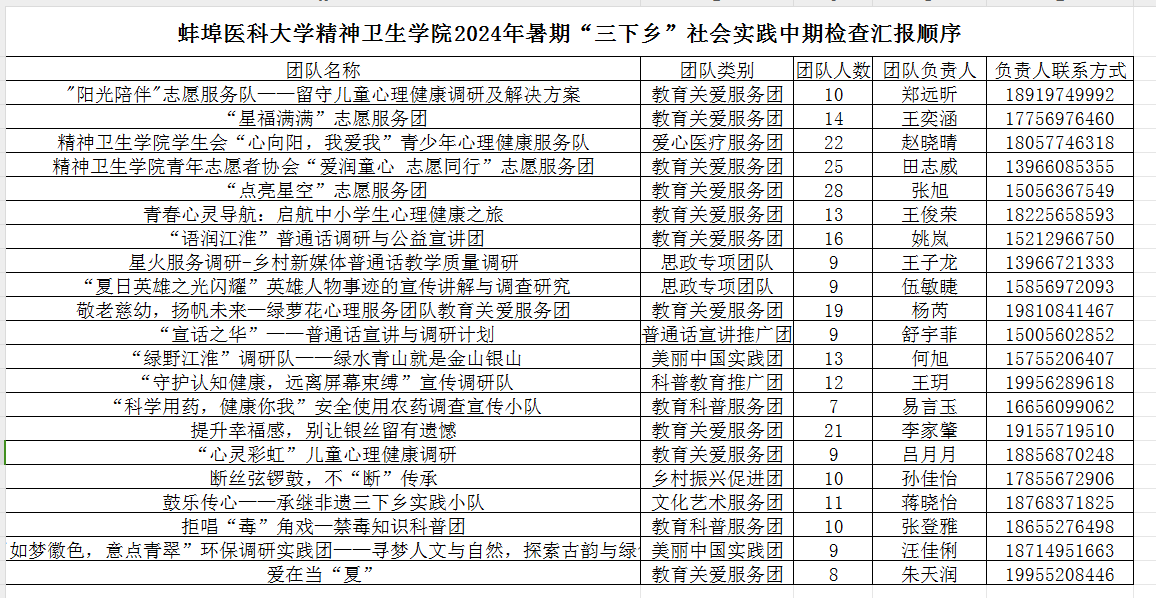 为着力加强大学生思想政治教育,有效促进大学生社会责任感培养,提高学生劳动能力和社会实践能力,2024年精神卫生学院共组建了22支暑期“三下乡”社会实践团队。为做好阶段性工作小结以更好地推进下一阶段工作,精神卫生学院于8月12日组织召开暑期“三下乡”社会实践项目中期检查汇报会。会议采用腾讯会议平台,学院党委书记马嬿、党委副书记李礼、团委副书记郭小虎以及各实践团队成员参加会议。汇报会由郭小虎主持。
