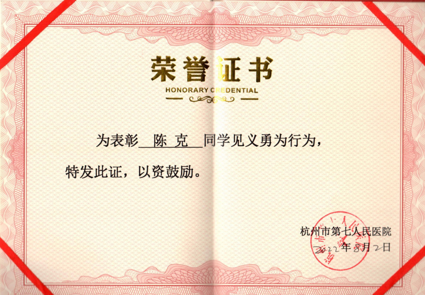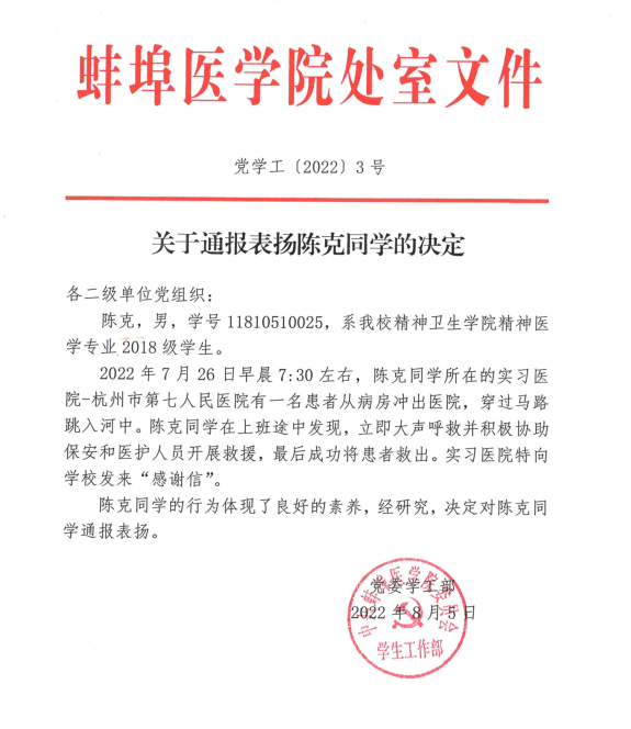 陈克,男,学号11810510025,系精神医学专业2018级学生。2022726日早晨7:30左右,陈克同学所在的实习医院(杭州市第七人民医院)有一名患者从病房冲出医院,穿过马路跳入河中。陈克同学在上班途中发现,立即大声呼救并积极协助保安和医护人员开展救援,最后成功将患者救出。