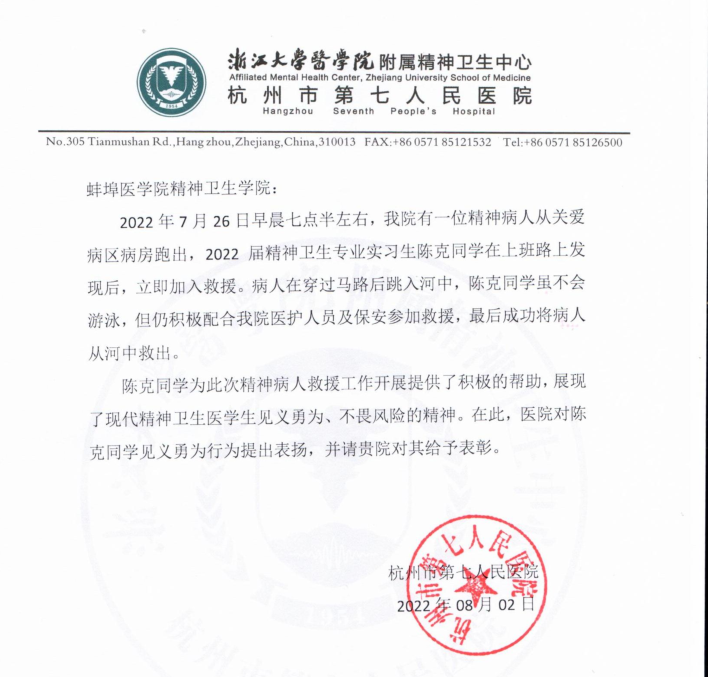 近日,我校收到浙江大学医学院附属精神卫生中心、杭州市第七人民医院发来的“感谢信”,反映实习生陈克同学在上班途中见义勇为紧急施救一名精神病人的先进事迹。