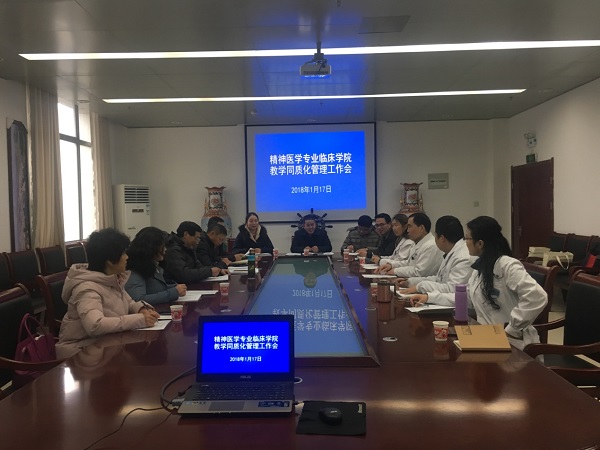 为规范精神医学专科临床学院教学管理,确保精神医学专业临床教学质量,更好的实现专业培养目标,1月17日上午,精神医学系在附属安民医院会议室召开精神医学专业临床学院教学同质化管理工作会。精神医学系主任许华山教授主持会议,附属安民医院院长崔明和芜湖市第四人民医院副院长蔡昌群、临床学院教研室主任、秘书、班主任、教师代表及精神医学系教学与学生管理人员代表参与会议。