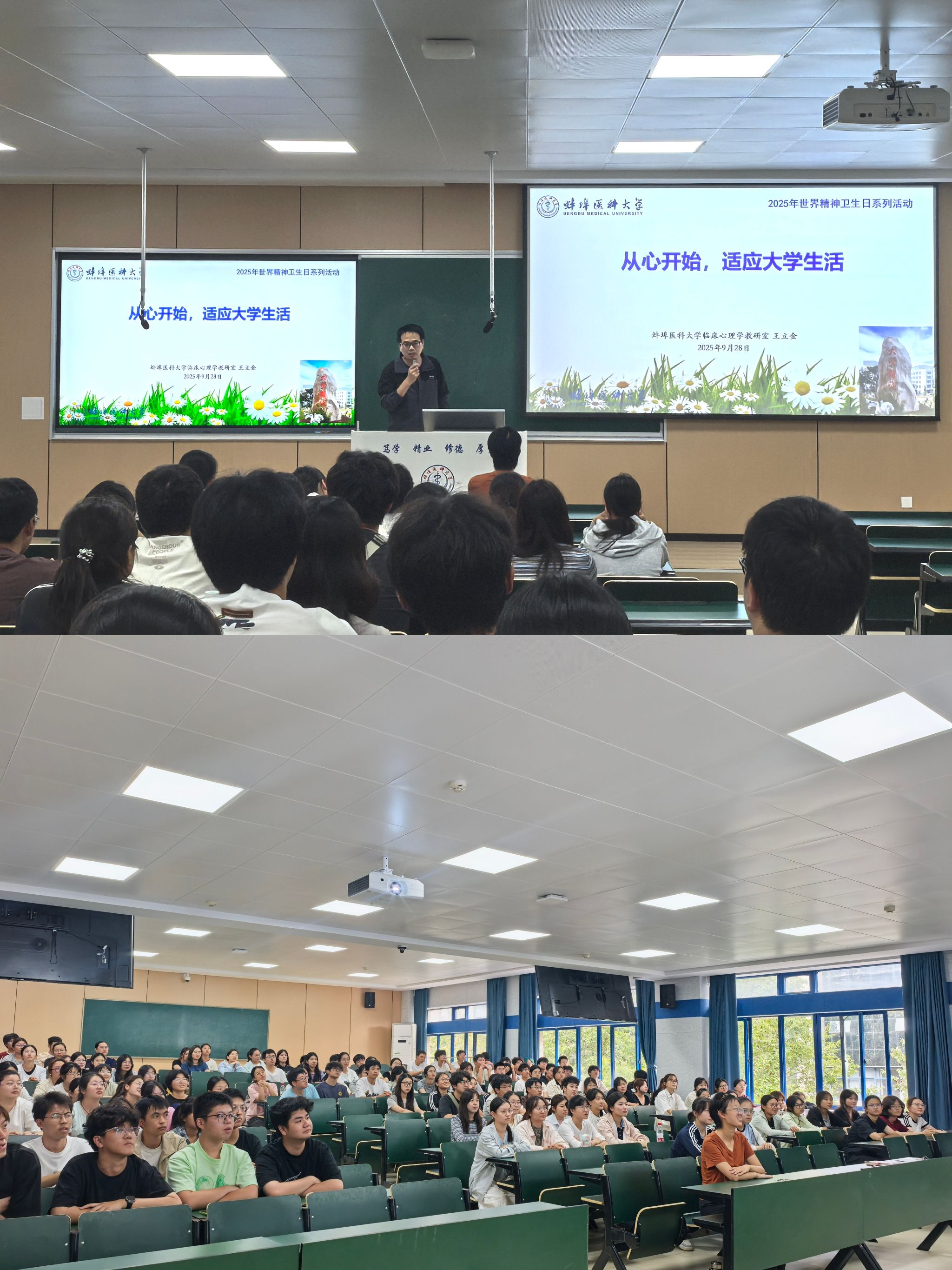 在2025年世界精神卫生日即将到来之际,蚌埠医科大学精神卫生学院于9月29日成功举办"从心开始,适应大学生活"新生适应性讲座。本次活动由2025级辅导员汪子月老师精心组织和安排,特邀临床心理学教研室王立金老师担任主讲,2025级全体新生参加。