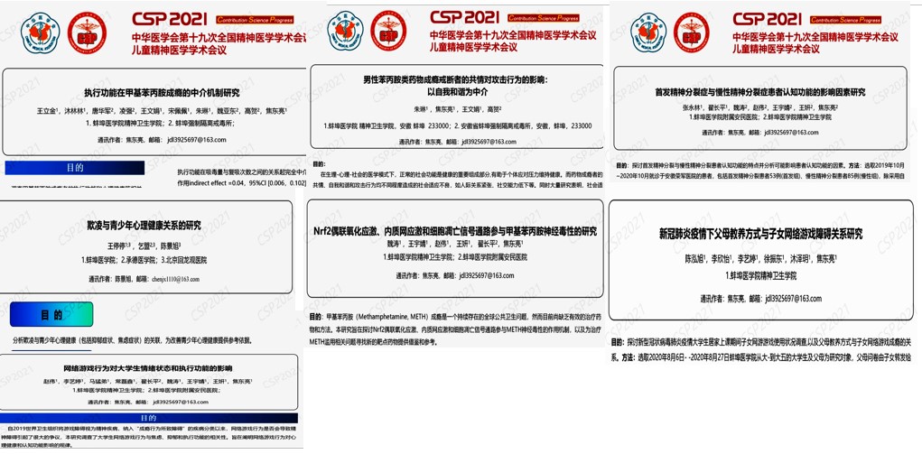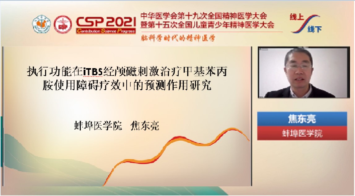 精神卫生学院发挥成瘾医学重点实验室平台的优势,扎实开展脑科学研究,积极组织教师投稿,共有7篇学术论文参加壁报交流。焦东亮博士作为特邀主持人在“成瘾菁英论坛”分会场主持学术报告,并作了题为《执行功能在iTBS经颅磁刺激治疗甲基苯丙胺使用障碍疗效中的预测作用研究》的交流发言。
