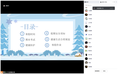 寒假伊始,各年级通过腾讯会议平台分别召开安全教育主题班会,从寒假安全须知、期末考试复习、健康安全防护、科学作息规划和实践活动暨劳动教育等六个方面对学生进行寒假安全教育。