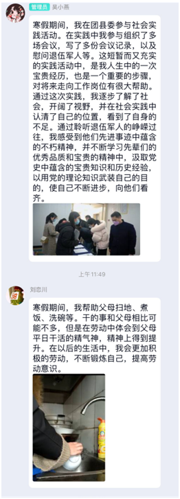 寒假期间,学院组织2021和2022年级开展劳动教育主题活动,组织学生在家积极为父母分担家务,鼓励学生结合专业学习到社区医院、乡村卫生所等参加实践活动。同学们在班级群里积极分享自己的劳动体验与感悟。 其中,2021年级精神医学吴小燕同学寒假期间在县团委庐江团县委参加社会实践,协助工作人员组织会议、作会议记录、慰问退伍军人等,她说:“这短暂而又充实的实践活动中,是我人生中的一次宝贵经历,也是一个重要的步骤,对将来走向工作岗位有很大帮助。通过这次实践,我逐步了解了社会,开阔了视野,并在社会实践中觉察到自身在基本素质和能力方面的不足和应加强的部分。通过聆听退伍军人峥嵘岁月的英雄事迹,我感受到他们在坚定的信仰中蕴含的不朽精神,并在不断学习先辈们的优秀品质和宝贵的精神中,汲取党史中蕴含的宝贵知识和历史经验,感悟伟大的建党精神。也促使自己谨记要加强党史学习,用党的理论知识武装自己,使自己不断进步,向前辈英雄学习!”