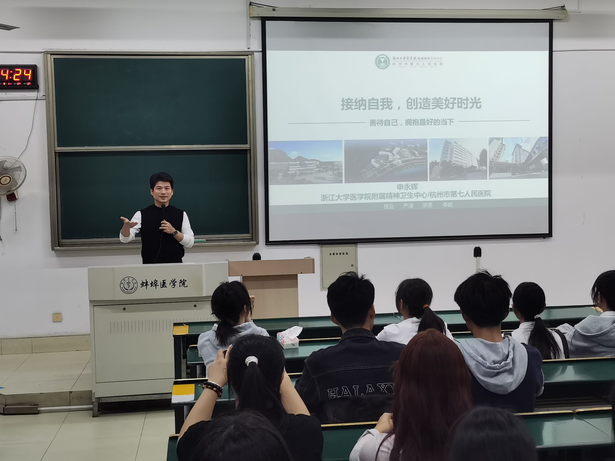 精神医学专业2012届毕业生、杭州市“十大杰出青年”、杭州七院心身科副主任申永辉和应用心理学专业首届本科毕业生、现宿州二院医学心理科心理咨询师徐经莹受邀分别为精神医学和应用心理学两个专业本科生做辅导报告。校园内线下会场和各临床学院、实习医院线上会议同步进行。学院党委书记马嬿、党委副书记李礼和各年级辅导员、全体本科生参加会议。