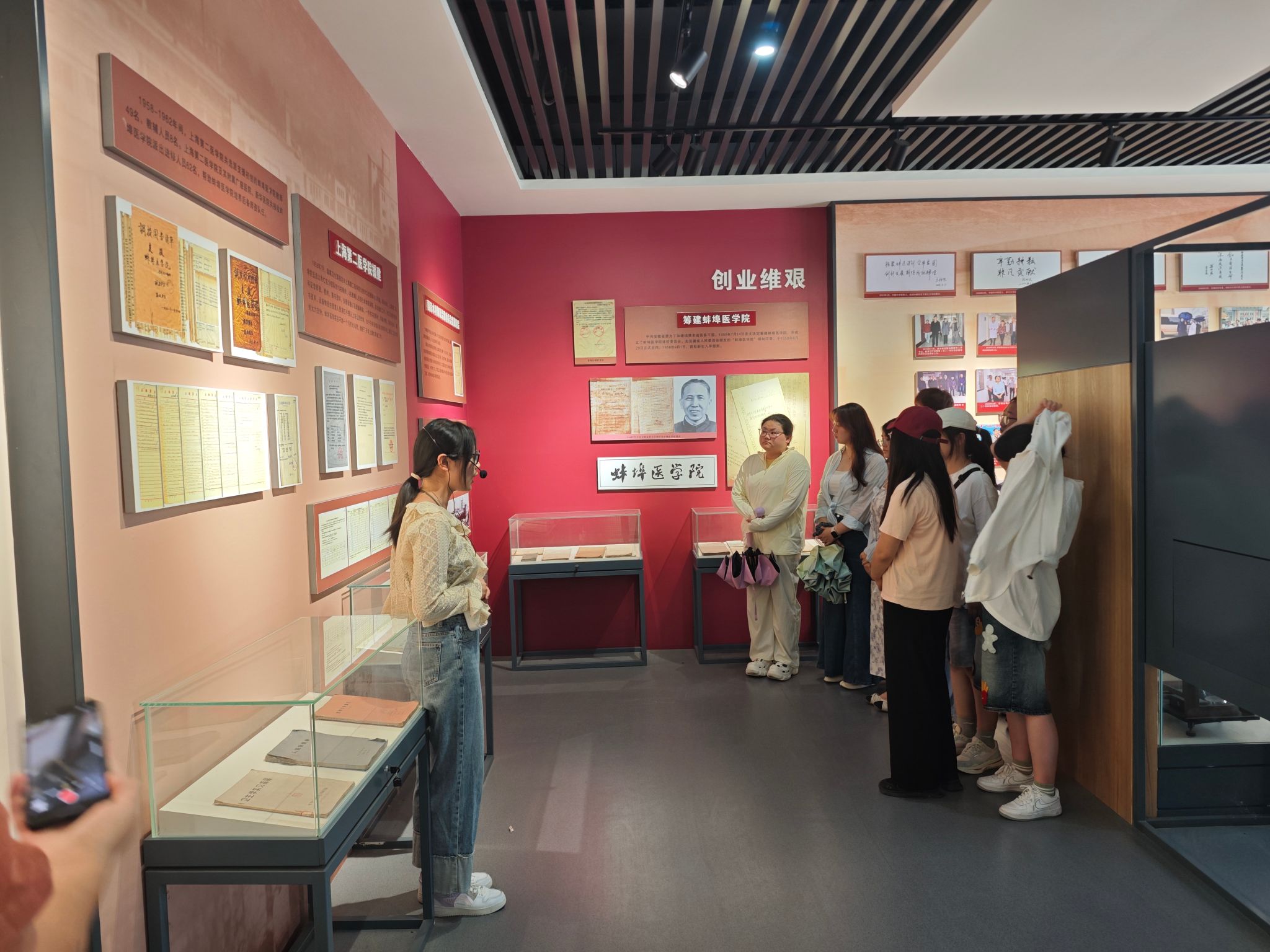 首任院长谢炘的事迹,让学生们感叹良久,“宁可让学生在我身上划错千刀,也不能让学生在病人身上划错一刀”的质朴诤言更指引着毕业生们在未来的道路上砥砺前行。从锈迹斑驳的工具器械、到泛黄褪色的课本教案,这一件件陈列的展品让学生们驻足良久,从老旧的物件中看到了蚌医前辈们奋斗不息的崇高背影,深刻感悟“艰苦创业、严谨治学、精诚为医、团结奉献”的蚌医精神。